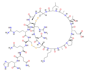 Apamin is a polypeptide possessing an amino acid sequence of H-Cys-Asn-Cys-Lys-Ala-Pro-Glu-Thr-Ala-Leu-Cys-Ala-Arg-Arg-Cys-Gln-Gln-His-NH2 (one-letter sequence CNCKAPETALCARRCQQH-NH2, with disulfide bonds between Cys1-Cys11 and Cys3-Cys15). Apamin is very rigid because of the two disulfide bridges and seven hydrogen bonds. The three-dimensional structure of apamin has been studied with several spectroscopical techniques: HNMR, Circular Dichroism, Raman spectroscopy, FT-IR. The structure is presumed to consist of an alpha-helix and beta-turns, but the exact structure is still unknown.[5]