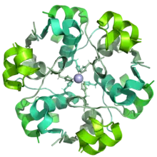 Insulin glulisine is a rapid-acting modified form of medical insulin that differs from human insulin in that the amino acid asparagine at position B3 is replaced by lysine and the lysine in position B29 is replaced by glutamic acid.[4] It was developed by Sanofi-Aventis and approved for marketing by the FDA in 2004;[5] it is sold under the trade name Apidra.[6] When injected subcutaneously, it appears in the blood earlier than human insulin.[7] When used as a meal time insulin, the dose is to be administered within 15 minutes before or 20 minutes after starting a meal.[8] Intravenous injections may also be used for extreme hyperglycemia, but must be performed under the supervision of a medical professional.[2]