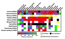 ApoD has been identified in 6 mammalian species as well as in chickens,[25][26] fruit flies,[27] plants[28] and bacteria.[29] In humans, monkeys, rabbits and guinea pigs, ApoD is highly expressed in the nervous system (brain, cerebellum, and peripheral nerves). Otherwise, expression levels of ApoD vary largely from organ to organ and species to species, with humans displaying the most diverse expression of ApoD, and mice and rats almost exclusively expressing ApoD in the nervous system (see Figure 2).