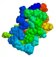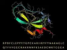 Aprotinin is a monomeric (single-chain) globular polypeptide derived from bovine lung tissue. It has a molecular weight of 6512 and consists of 16 different amino acid types arranged in a chain 58 residues long[4][5] that folds into a stable, compact tertiary structure of the 'small SS-rich" type, containing 3 disulfides, a twisted β-hairpin and a C-terminal α-helix.[6]