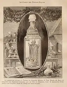 The 'tradename' "Manna di San Nicola" ("Manna of St. Nicholas of Bari") may have been a marketing device intended to divert the authorities, given that the poison was openly sold both as a cosmetic and a devotionary object in vials that included a picture of St. Nicholas. Over 600 victims[2] are alleged to have died from this poison, mostly husbands.