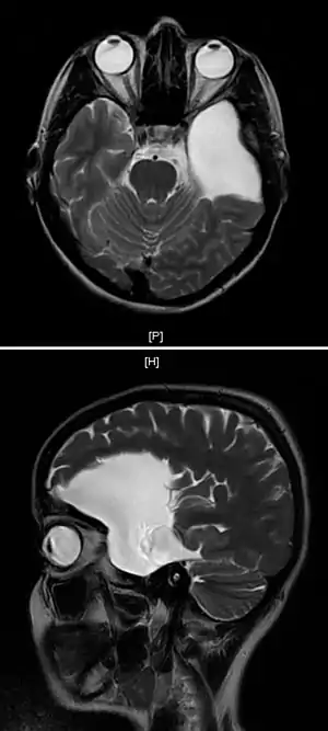| An MRI of a 25-year-old woman with left frontotemporal arachnoid cyst. | |
