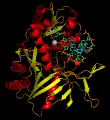 | The PIWI domain of an argonaute protein from A. fulgidus, bound to a short double-stranded RNA fragment and illustrating the base-pairing and aromatic stacking stabilization of the bound conformation. | |
