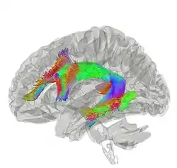 In neuroanatomy, the arcuate fasciculus (AF; from Latin 'curved bundle') is a bundle of axons that generally connects the Broca's area and the Wernicke's area in the brain. It is an association fiber tract connecting caudal temporal cortex and inferior frontal lobe.[1]