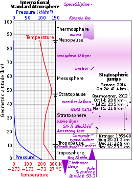 The Armstrong limit or Armstrong's line is a measure of altitude above which atmospheric pressure is sufficiently low that water boils at the normal temperature of the human body. Exposure to pressure below this limit results in a rapid loss of consciousness, followed by a series of changes to cardiovascular and neurological functions, and eventually death, unless pressure is restored within 60–90 seconds.[1] On Earth, the limit is around 18–19 km (11–12 mi; 59,000–62,000 ft) above sea level,[1][2] above which atmospheric air pressure drops below 0.0618 atm (6.3 kPa, 47 mmHg, or about 1 psi). The U.S. Standard Atmospheric model sets the Armstrong pressure at an altitude of 63,000 feet (19,202 m).