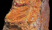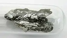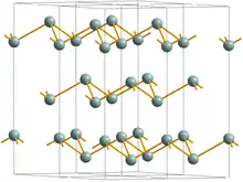 The three most common arsenic allotropes are gray, yellow, and black arsenic, with gray being the most common.[15] Gray arsenic (α-As, space group R3m No. 166) adopts a double-layered structure consisting of many interlocked, ruffled, six-membered rings. Because of weak bonding between the layers, gray arsenic is brittle and has a relatively low Mohs hardness of 3.5. Nearest and next-nearest neighbors form a distorted octahedral complex, with the three atoms in the same double-layer being slightly closer than the three atoms in the next.[16] This relatively close packing leads to a high density of 5.73 g/cm3.[17] Gray arsenic is a semimetal, but becomes a semiconductor with a bandgap of 1.2–1.4 eV if amorphized.[18] Gray arsenic is also the most stable form. Yellow arsenic is soft and waxy, and somewhat similar to tetraphosphorus (P4).[19] Both have four atoms arranged in a tetrahedral structure in which each atom is bound to each of the other three atoms by a single bond. This unstable allotrope, being molecular, is the most volatile, least dense, and most toxic. Solid yellow arsenic is produced by rapid cooling of arsenic vapor, As4. It is rapidly transformed into gray arsenic by light. The yellow form has a density of 1.97 g/cm3.[17] Black arsenic is similar in structure to black phosphorus.[17] Black arsenic can also be formed by cooling vapor at around 100–220 °C and by crystallization of amorphous arsenic in the presence of mercury vapors.[20] It is glassy and brittle. Black arsenic is also a poor electrical conductor.[21] As arsenic's triple point is at 3.628 MPa (35.81 atm), it does not have a melting point at standard pressure but instead sublimes from solid to vapor at 887 K (615 °C or 1137 °F).[2]
