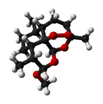 Artemether is a methyl ether derivative of artemisinin, which is a peroxide-containing lactone isolated from the antimalarial plant Artemisia annua. It is also known as dihydroartemisinin methyl ether, but its correct chemical nomenclature is (+)-(3-alpha,5a-beta,6-beta,8a-beta, 9-alpha,12-beta,12aR)-decahydro-10-methoxy-3,6,9-trimethyl-3,12-epoxy-12H-pyrano(4,3-j)-1,2-benzodioxepin. It is a relatively lipophilic and unstable drug,[22] which acts by creating reactive free radicals in addition to affecting the membrane transport system of the plasmodium organism.[14]