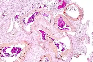 | Micrograph of an arteriovenous malformation in the brain. HPS stain. | |