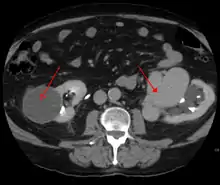 Pulmonary arteriovenous malformations are abnormal communications between the veins and arteries of the pulmonary circulation, leading to a right-to-left blood shunt.[5][6] They have no symptoms in up to 29% of all cases,[7] however they can give rise to serious complications including hemorrhage, and infection.[5] They are most commonly associated with hereditary hemorrhagic telangiectasia.[6]