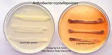 Arthrobacter can be grown on mineral salts pyridone broth, where colonies have a greenish metallic center on incubated at 20 °C (68 °F). Under the microscope, Arthrobacter appear as rods when rapidly dividing, and cocci when in stationary phase. Dividing cells may also appear as chevrons ("V" shapes). Other notable characteristics are that it can use pyridone as its sole carbon source, and that its cocci are resistant to desiccation and starvation.