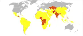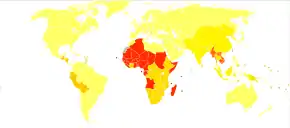 About 0.8 to 1.2 billion people globally have ascariasis, with the most heavily affected populations being in sub-Saharan Africa, Latin America, and Asia.[1][10][11] This makes ascariasis the most common form of soil-transmitted helminthiasis.[10] As of 2010 it caused about 2,700 deaths a year, down from 3,400 in 1990.[12] Another type of Ascaris infects pigs.[1] Ascariasis is classified as a neglected tropical disease.[6]