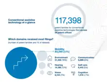 This "well-established status" is reflected in the patent filings between 2013 and 2017.[45] Patent registrations for assistive technologies identified as conventional are nearly eight times larger than the ones for emerging assistive technologies. However, patent filings related to more recent emerging assistive technologies are growing almost three times as fast as those pertaining to conventional ones. Patent filings in both conventional and emerging assistive technology are highly concentrated on mobility, hearing and vision. Investment in emerging assistive technology also focuses on environment. In the conventional sector, mobility represent 54% of all patents fillings, and is an indication of increased interest in advanced mobility assistive product categories, such as advanced prosthetics, walking aids, wheelchairs, and exoskeletons.