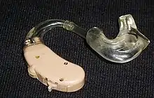 A hearing aid or deaf aid is an electro-acoustic device which is designed to amplify sound for the wearer, usually with the aim of making speech more intelligible, and to correct impaired hearing as measured by audiometry. This type of assistive technology helps people with hearing loss participate more fully in their hearing communities by allowing them to hear more clearly. They amplify any and all sound waves through use of a microphone, amplifier, and speaker. There is a wide variety of hearing aids available, including digital, in-the-ear, in-the-canal, behind-the-ear, and on-the-body aids.