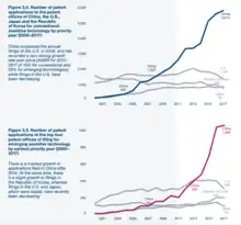 Number of patent applications for conventional (top) and emerging (bottom) assisting technologies between 2000 and 2017. China surpassed the annual filings of the US in 2008 and has recorded a very strong growth ever since in both conventional and emerging sectors.