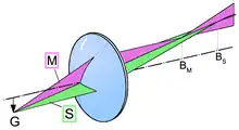 In third-order astigmatism, the sagittal and transverse rays form foci at different distances along the optic axis. These foci are called the sagittal focus and the transverse focus, respectively. In the presence of astigmatism, an off-axis point on the object is not sharply imaged by the optical system. Instead, sharp lines are formed at the sagittal and transverse foci. The image at the transverse focus is a short line, oriented in the direction of the sagittal plane; images of circles centered on the optic axis, or lines tangential to such circles, will be sharp in this plane. The image at the sagittal focus is a short line, oriented in the tangential direction; images of spokes radiating from the center are sharp at this focus. In between these two foci, a round but "blurry" image is formed. This is called the medial focus or circle of least confusion. This plane often represents the best compromise image location in a system with astigmatism.
