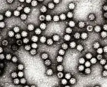 Astroviruses are a type of virus that was first discovered in 1975 using electron microscopes following an outbreak of diarrhea in humans.[1] In addition to humans, astroviruses have now been isolated from numerous mammalian animal species (and are classified as genus Mamastrovirus) and from avian species such as ducks, chickens, and turkey poults (classified as genus Avastrovirus). Astroviruses are 28–35 nm diameter, icosahedral viruses that have a characteristic five- or six-pointed star-like surface structure when viewed by electron microscopy. Along with the Picornaviridae and the Caliciviridae, the Astroviridae comprise a third family of nonenveloped viruses whose genome is composed of plus-sense, single-stranded RNA.[2] Astrovirus has a non-segmented, single stranded, positive sense RNA genome within a non-enveloped icosahedral capsid.[3] Human astroviruses have been shown in numerous studies to be an important cause of gastroenteritis in young children worldwide.[2] In animals, Astroviruses also cause infection of the gastrointestinal tract but may also result in encephalitis (humans and cattle), hepatitis (avian) and nephritis (avian).[4]