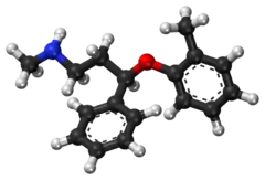 Atomoxetine, sold under the brand name Strattera, among others, is a medication used to treat attention deficit hyperactivity disorder (ADHD).[10] It may be used alone or along with psychostimulants.[11][12] It is also used as a cognitive enhancer to improve alertness, attention, and memory.[13][14][15] Use of atomoxetine is only recommended for those who are at least six years old.[10] It is taken orally.[10] Atomoxetine is a norepinephrine reuptake inhibitor and is believed to work by increasing norepinephrine and dopamine levels in the brain.[10][8]