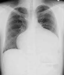 Adults with an uncorrected ASD present with symptoms of dyspnea on exertion (shortness of breath with minimal exercise), congestive heart failure, or cerebrovascular accident (stroke). They may be noted on routine testing to have an abnormal chest X-ray or an abnormal ECG and may have atrial fibrillation. If the ASD causes a left-to-right shunt, the pulmonary vasculature in both lungs may appear dilated on chest X-ray, due to the increase in pulmonary blood flow.[32]