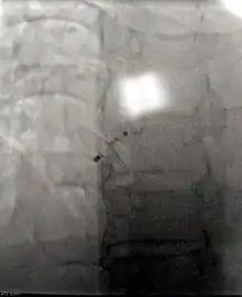 Percutaneous device closure involves the passage of a catheter into the heart through the femoral vein guided by fluoroscopy and echocardiography.[12] An example of a percutaneous device is a device which has discs that can expand to a variety of diameters at the end of the catheter. The catheter is placed in the right femoral vein and guided into the right atrium. The catheter is guided through the atrial septal wall and one disc (left atrial) is opened and pulled into place. Once this occurs, the other disc (right atrial) is opened in place and the device is inserted into the septal wall. This type of PFO closure is more effective than drug or other medical therapies for decreasing the risk of future thromboembolism.[12][46][47] The most common adverse effect of PFO device closure is new-onset atrial fibrillation.[48] Other complications, all rare, include device migration, erosion and embolization and device thrombosis or formation of an inflammatory mass with risk for recurrent ischemic stroke.[49][50]