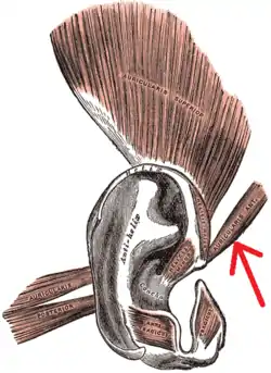 ![]() The muscles of the auricula. Anterior auricular is at right (indicated by the red arrow). | |