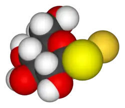 Gold thioglucose features gold in the oxidation state of +I, like other gold thiolates. It is a water-soluble, non-ionic species that is assumed to exist as a polymer.[1] Under physiological conditions, an oxidation-reduction reaction leads to the formation of metallic gold and sulfinic acid derivative of thioglucose.