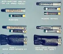 - Autoinjectors are often used in the military to protect personnel from chemical warfare agents. In the U.S. military, atropine and 2-PAM-Cl (pralidoxime chloride) are used for first aid ("buddy aid" or "self aid") against nerve agents. An issue item, the Mark I NAAK (Nerve Agent Antidote Kit), provides these drugs in the form of two separate autoinjectors. A newer model, the ATNAA (Antidote Treatment Nerve Agent Auto-Injector), has both drugs in one syringe, allowing for the simplification of administration procedures. In the Gulf War, accidental and unnecessary use of atropine autoinjectors supplied to Israeli civilians proved to be a major medical problem.[4]