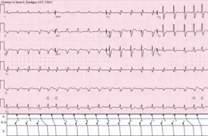 | Junctional tachycardia (rate about 115/min) dissociated from a slightly slower sinus tachycardia (rate about 107/min). Junctional tachycardia is both an SVT and an automatic tachycardia |