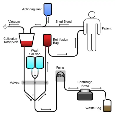Autotransfusion is a process wherein a person receives their own blood for a transfusion, instead of banked allogenic (separate-donor) blood. There are two main kinds of autotransfusion: Blood can be autologously "pre-donated" (termed so despite "donation" not typically referring to giving to one's self) before a surgery, or alternatively, it can be collected during and after the surgery using an intraoperative blood salvage device (such as a Cell Saver, HemoClear or CATS). The latter form of autotransfusion is utilized in surgeries where there is expected a large volume blood loss – e.g. aneurysm, total joint replacement, and spinal surgeries. The effectiveness, safety, and cost-savings of intraoperative cell salvage in people who are undergoing thoracic or abdominal surgery following trauma is not known.[1]