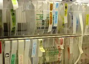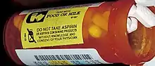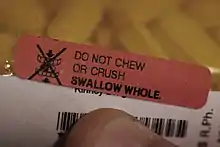 An auxiliary label (also called cautionary and advisory label or prescription drug warning label) is a label added on to a dispensed medication package by a pharmacist in addition to the usual prescription label. These labels are intended to provide supplementary information regarding the safe administration, use, and storage of the medication.[1] Auxiliary labels provide information which can augment but not replace verbal counselling from a pharmacist.[2]