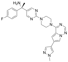 Avapritinib, sold under the brand name Ayvakit among others, is a medication used for the treatment of advanced systemic mastocytosis and for the treatment of tumors due to one specific rare mutation: it is specifically intended for adults with unresectable or metastatic gastrointestinal stromal tumor (GIST) that harbor a platelet-derived growth factor receptor alpha (PDGFRA) exon 18 mutation.[1][4] Avapritinib is a kinase inhibitor.[4]