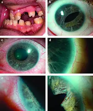 a) Microdontia and hypodontia. b) Slit pupil and iris atrophy right eye. c) Corectopia with iris atrophy left eye. d) Posterior embryotoxon right eye. e) Posterior embryotoxon left eye. f) Broad peripheral anterior synechiae right eye.[1]