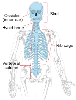 The axial skeleton is the part of the skeleton that consists of the bones of the head and trunk of a vertebrate. In the human skeleton, it consists of 80 bones and is composed of six parts; the skull (22 bones), also the ossicles of the middle ear, the hyoid bone, the rib cage, sternum and the vertebral column. The axial skeleton together with the appendicular skeleton form the complete skeleton. Another definition of axial skeleton is the bones including the vertebrae, sacrum, coccyx, skull, ribs, and sternum.[1]
