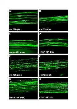 | Fluorescent micrographs (100x) of Wallerian degeneration in cut and crushed peripheral nerves. Left column is proximal to the injury, right is distal. A and B: 37 hours post cut. C and D: 40 hours post crush. E and F: 42 hours post cut. G and H: 44 hours post crush. | |