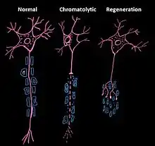 Upon injury of a peripheral axon, the entire neuron immediately reacts in order to regenerate the axon.[3] This reaction requires an increased metabolic activity and is initiated by chromatolysis. Chromatolysis is characterized as the dissolution of protein-producing structures in the cell body of a neuron[4] and is a term used to characterize apoptosis of neuronal cells. During chromatolysis, the soma and nucleus round and enlarge, the Nissl bodies and Golgi bodies both disintegrate, and the cytocentrum is cleared. In most cases, the axotomy response in peripheral axons ends in cell healing and regeneration, though it may occasionally end in cell death. Regeneration occurs because of microglial hyperplasia and astroglial hypertrophy, activities that are lacking in the central axotomy response.
