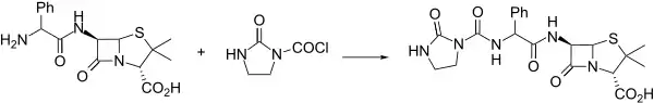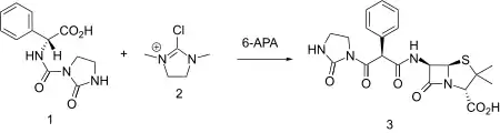 An interesting alternative synthesis of azlocillin involves activation of the substituted phenylglycine analogue 1 with 1,3-dimethyl-2-chloro-1-imidazolinium chloride (2) and then condensation with 6-APA.