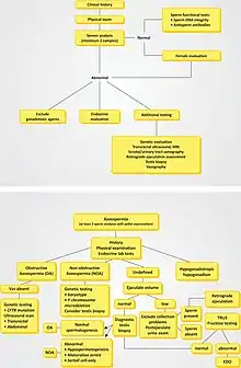 {{cite book}}:|author1=has generic name (help) - Jarvi, K; Lo, K; Fischer, A; Grantmyre, J; Zini, A; Chow, V; Mak, V (2010). "CUA Guideline: The workup of azoospermic males". Canadian Urological Association Journal. 4 (3): 163–7. doi:10.5489/cuaj.10050. PMC 2874589. PMID 20514278.