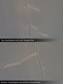 Azospirillum promote plant growth through a variety of mechanisms. Many Azospirillum excrete plant hormones that alter how the roots of plants grow. Affected roots frequently grow more branches and fine root hairs, which may help the plants acquire water and nutrients more efficiently.[14] In addition to these changes, Azospirillum can also alter the forms of plant nutrients such as nitrogen and phosphorus to make them more available to plants.[14] However, how much nitrogen Azospirillum contribute to crop plants via biological fixation is debated.[15] Azospirillum also make antioxidants that protect the plant roots from stresses due to drought and flooding.[14]