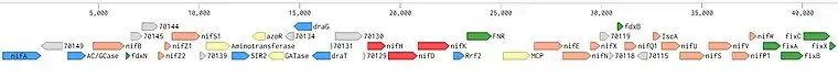 The genome of A. brasilense Sp245 has been sequenced and is 7Mbp in size and spread across 7 chromosomes. The high GC content (70%) makes it challenging to engineer.[5] Sp245 can be transformed with OriV origin of replication plasmids through conjugation and electroporation. The strain is natively resistant to both spectinomycin and ampicillin antibiotics. Kanamycin resistance is used as a selectable marker.[6] A. brasilense has a high evolutionary adaptation rate driven by codon mutation and transposon hopping.