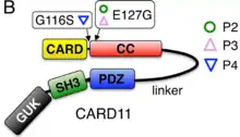Germline gain-of-function mutations in CARD11 manifest a less severe illness than loss-of-function mutations seen in CARD11 deficiency (OMIM #615206), an autosomal recessive condition manifesting in severe combined immunodeficiency.[1]