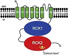 BK channels are quite similar to voltage gated K⁺ channels, however, in BK channels only one positively charged residue (Arg213) is involved in voltage sensing across the membrane.[5] Also unique to BK channels is an additional S0 segment, this segment is required for β subunit modulation.[7][8] and voltage sensitivity.[9]