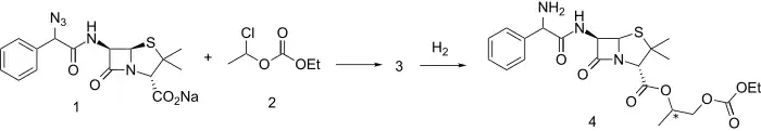 An azidopenicillin sodium salt (1) is reacted with mixed carbonate ester 2 (itself prepared from acetaldehyde and ethyl chloroformate) to give ester 3. Reduction of the azido linkage with hydrogen and a suitable catalyst produces bacampillin (4). Both enantiomers are active. The drug is rapidly absorbed from the gastrointestinal tract and is quickly cleaved by serum esterases to bioactive ampicillin, acetaldehyde, CO2 and ethanol.