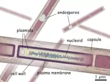 | Photomicrograph of Bacillus anthracis, stained using fuchsin-methylene blue spore stain) | |