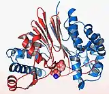 The plcR gene is part of a two-gene operon with papR.[21][22] The papR gene encodes a small protein which is secreted from the cell and then reimported as a processed heptapeptide forming a quorum-sensing system.[22][23] The lack of PlcR in B. anthracis is a principle characteristic differentiating it from other members of the B. cereus group. While B. cereus and B. thuringiensis depend on the plcR gene for expression of their virulence factors, B. anthracis relies on the pXO1 and pXO2 plasmids for its virulence.[11] Bacillus cereus biovar anthracis, i.e. B. cereus with the two plasmids, is also capable of causing anthrax.