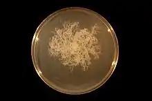 B. mycoides are rod-shaped cells about 1 micron across and 3 to 5 microns long. When growing, they either grow as single cells or form loosely connected chains of cells.[1] They are not motile. B. mycoides can survive with or without oxygen and grows at temperatures ranging from 10 to 15 °C to 35–40 °C.[1] B. mycoides is distinguished from a number of other Bacillus species in the unusual morphology of the colonies it forms when grown on agar plates. B. mycoides forms white opaque colonies that are characteristically hairy in appearance (often referred to as "rhizoid").[1] These colonies rapidly spread to fill the plate and are characterized by a repeating spiral pattern.[1][2] B. mycoides has the unusual property of being able to respond to mechanical force and surface structure variations in the media on which it is growing.[3]