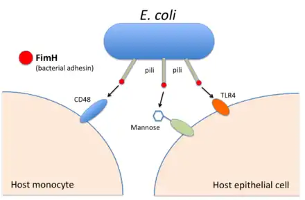 The best characterized bacterial adhesin is the type 1 fimbrial FimH adhesin. This adhesin is responsible for D-mannose sensitive adhesion.[3] The bacterium synthesizes a precursor protein consisting of 300 amino acids then processes the protein by removing several signal peptides ultimately leaving a 279 amino acid protein.[3] Mature FimH is displayed on the bacterial surface as a component of the type 1 fimbrial organelle.[3]
