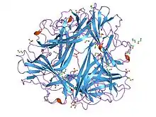 In 1999, the structure of FimH was resolved via x-ray crystallography. FimH is folded into two domains. The N terminal adhesive domain plays the main role in surface recognition while the C-terminal domain is responsible for organelle integration.[5] A tetra-peptide loop links the two domains. Additionally, a carbohydrate-binding pocket has been identified at the tip of the N-terminal adhesive domain.[5] This basic structure is conserved across type 1 fimbrial adhesins though recent studies have shown that in vitro induced mutations can lead to the addition of C-terminal domain specificity resulting in a bacterial adhesion with dual bending sites and related binding phenotypes.[6]