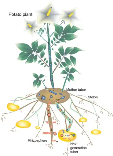 The plant microbiome was recently discovered to originate from the seed.[45] Microorganism which are transmitted via seed migrate into the developing seedling in a specific route in which certain community move to the leaves and others to the roots.[45] In the diagram on the right, microbiota colonizing the rhizosphere, entering the roots and colonizing the next tuber generation via the stolons, are visualized with a red color. Bacteria present in the mother tuber, passing through the stolons and migrating into the plant as well as into the next generation of tubers are shown in blue.[44]
