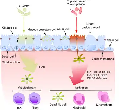 The symbiotic relationship between a host and its microbiota is under laboratory research for how it may shape the immune system of mammals.[51][52] In many animals, the immune system and microbiota may engage in "cross-talk" by exchanging chemical signals, which may enable the microbiota to influence immune reactivity and targeting.[53] Bacteria can be transferred from mother to child through direct contact and after birth.[54] As the infant microbiome is established, commensal bacteria quickly populate the gut, prompting a range of immune responses and "programming" the immune system with long-lasting effects.[53] The bacteria are able to stimulate lymphoid tissue associated with the gut mucosa, which enables the tissue to produce antibodies for pathogens that may enter the gut.[53]