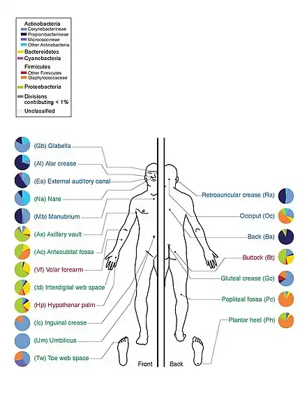 The human microbiota includes bacteria, fungi, archaea and viruses. Micro-animals which live on the human body are excluded. The human microbiome refers to their collective genomes.[15]