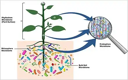 Diverse microbial communities of characteristic microbiota are part of plant microbiomes, and are found on the outside surfaces and in the internal tissues of the host plant, as well as in the surrounding soil.[1]